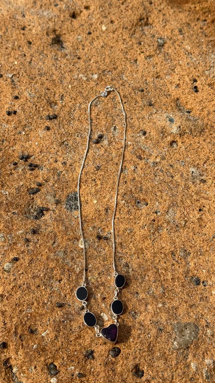 Colar em prata 950, com corrente veneziana fina e fecho tipo mosquetão. A parte central da peça é composta por cinco elementos lapidados: uma pedra central em formato de coração, em ametista roxa translúcida, ladeada por quatro pedras ovais de ônix natural, com lapidação cabochão. As gemas são fixadas por engastes em prata com acabamento polido. Comprimento total da corrente: cm (inserir medida, se desejar).